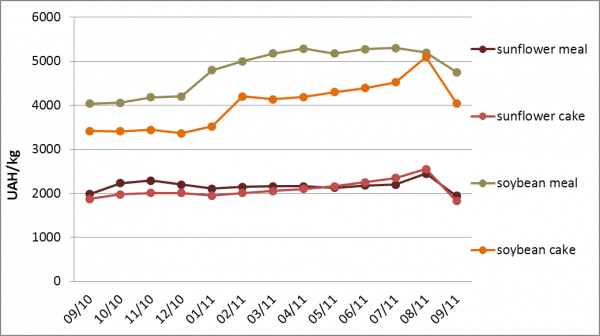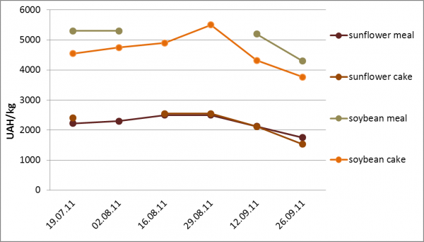 Good crops of sunflower and favorable weather conditions resulted in price reduction for sunflower meal and cake to the level of the same period last year. Prices for soybean cake and meal also dropped, but not to the last year level.
