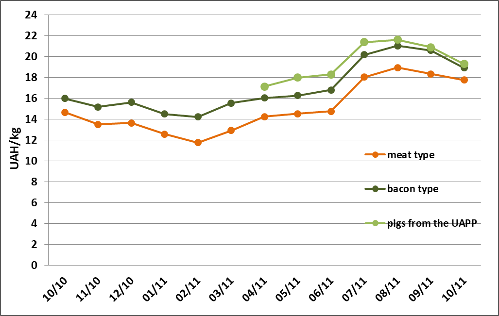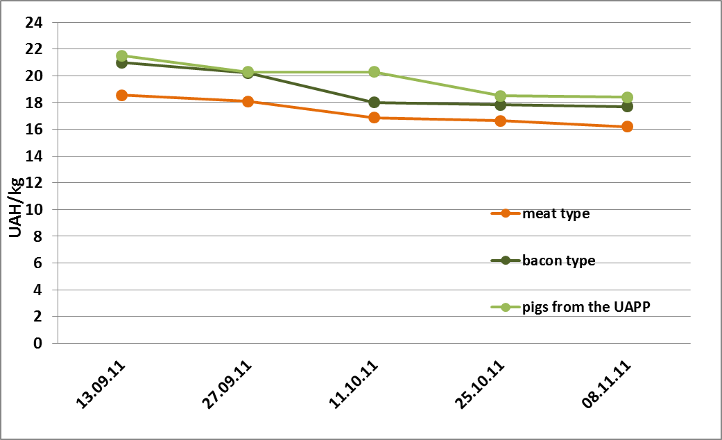 In October the price for bacon type pigs decreased by 3.2% (0.6 UAH/kg), up to 17.75UAH/kg. The October prices for meat type pigs decreased by 8.2% (1.7UAH/kg), in comparison with September; the price for meat type pigs is 18.9 UAH/kg. The prices for meat type of the in the enterprises which are members of Ukrainian Pig Producers Association decreased by 7.7%(1.6UAH/kg) up to 19.3UAH/kg.