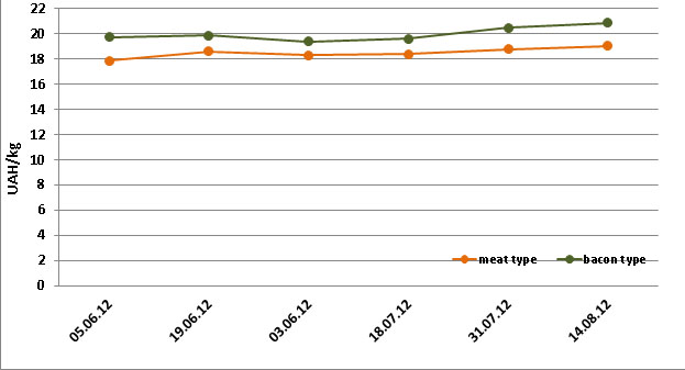 As of the 4th of August the average price for meat type pigs was 20.9 UAH/kg, the price for bacon type pigs was 19,5 UAH/kg.
