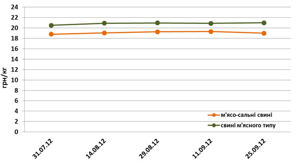 Fig. 1. Live pigs price dynamic, September 2011 – September 2012 UAH/kg (according to data of "Dykun" company)