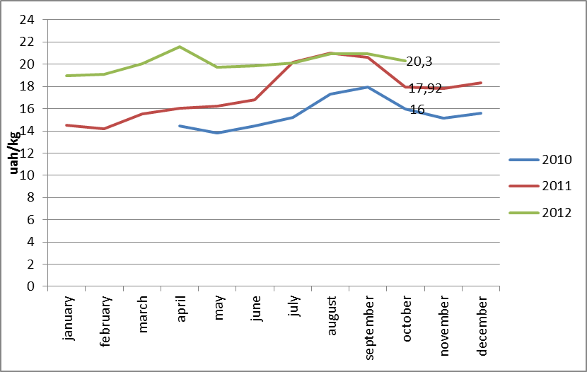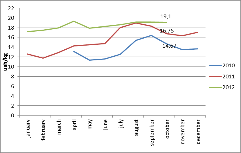 It should also be noted that pig prices didn’t fluctuate as much as last year and didn’t follow the trends of previous years(graph.1and 2). The biggest leap in prices was in April, but they stabilized the following month. The record volume of import was the main factor that restricted acute price fluctuations. It was imported 83 thousand tons of pork during 9 month of 2010; it was imported 61.8 83 thousand tons of pork during 9 month of 2011 and it was imported 237.6 thousand tons of pork during 9 month of the current year.