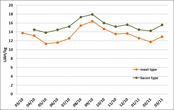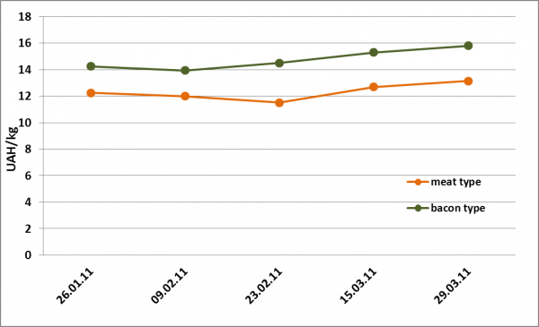 As of March, 29 the average bacon type pigs price was 13.13 UAH/kg in live weight and the price per meat type pigs was 15,8 UAH/kg. In general the price per bacon type pigs has risen by 7.3% since 26.01.11 and per meat type – by 10.9%.