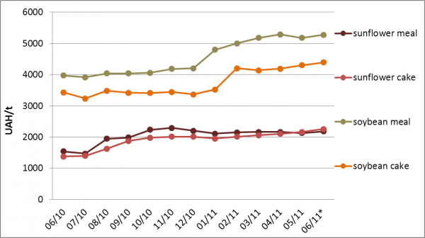 Within a month price for sunflower meal grew by 2.4% (50 UAH/t) to the level of 2180 UAH/t. Sunflower cake rose in price by 4.2% (90 UAH/t) to 2250 UAH/t. As for soybean meal, it has risen by almost 2% (100 UAH/t) to 5275 UAH/t. The price for soybean cake went up by 2.2% (94 UAH/t) to 4394 UAH/t.