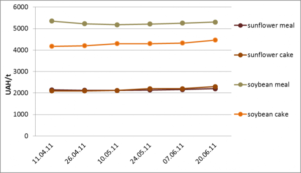 In the period from June 7 to June 20 prices for concentrated feed significantly increased. Sunflower meal prices increased by almost 2% (40 UAH/t) to 2200 UAH /t, and sunflower cake has up in price by 4.6% (100 UAH/t) to 2300 UAH/t. As for by-products of soybean processing, the meal out of this olive up by 1% (50 UAH/t) to the mark of 5300 UAH/t, and the price for cake has risen by 3.2% (138 UAH/ton) to 4463 UAH/t.