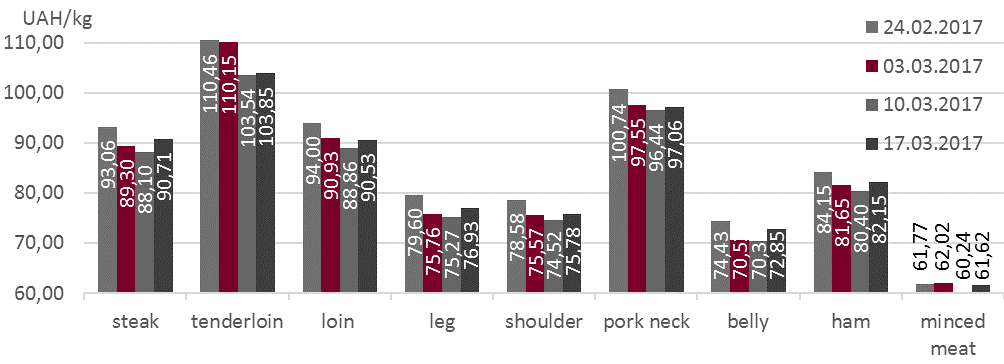 Pork prices slightly increased in the retail networks at the end of the second half of March. Thus, belly rose by 2.5 UAH/kg — up to an average of 72.85 UAH / kg while steak again overleaped the level of 90 UAH/kg by adding 2.6 UAH/kg. Ham, leg and loin went up a little more than by 1.5 UAH/kg. Minced pork grew by 2.3% or 1.4 UAH / kg per week. Pork shoulder price rose above the mark of 75 UAH/kg. Retail price on premium parts of pork neck and tenderloin rose less than by 1%, a kilo of which cost 97.1 UAH and 103.85 UAH, respectively at the end of previous week.