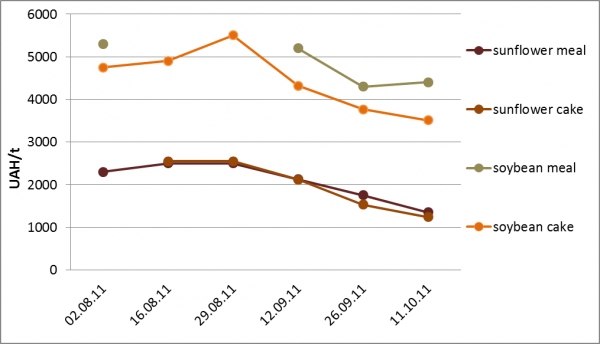 In early October, the situation at the market of concentrated feed was similar to that observed in late September - prices continued to go down. The price for sunflower meal changed greatly. During the period from September 26 to October 11 it fell down by 23.1% (405 UAH/ton) to 1,350 UAH/t. Sunflower and soybean cake price decreased by 19.1% (292 UAH/ton) and 6.8% (256 UAH/ton) to 1,238 UAH/t and 3,510 UAH/t respectively. Soybean meal price increased by 2.3% (100 UAH/t) and amounted 4,400 UAH/t.