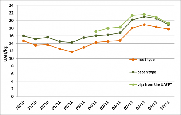 Pic. 1. Live pigs price dynamics October 2010-October 2011, UAH/kg(according to the date of meat processing companies)