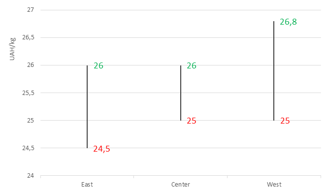 So, this week prices in the Center will vary on level 25-26 UAH/kg, in eastern regions will be 24.5-26 UAH/kg, in western — 25-26.8 UAH/kg.