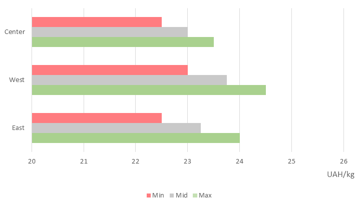 The current week will be noticed by synchronization of the lowest prices in the East and the Center (22.5 UAH/kg) and decreasing the price range in the West to 1.5 UAH.