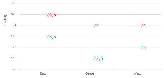 That’s why on the 4th week low prices will be occurred in central regions, where the kilo of live pork will cost from 22.5 to 24 UAH/kg. In the West prices will hold the «Golden mean» (23-24 UAH/kg) and in eastern region prices will range from 23.5-24.5 UAH per kilo of live weight of the first category.