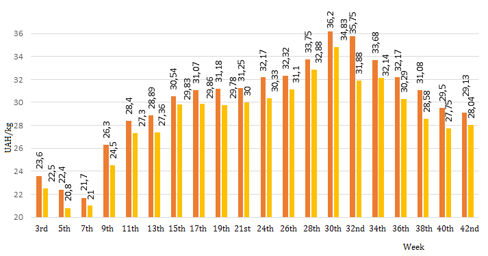 The live pigs’ price decrease slows down little by little. So that, during week 41 the average tick has decreased on 0.37 UAH/kg or 1.26%. And it made 29.46 UAH/kg. This week producers expect the price of kilo of pork (live weight basis) to vary within 28-29.5 UAH. That’s why the upper range limit is 0.5 UAH/kg lower than the index of previous week.