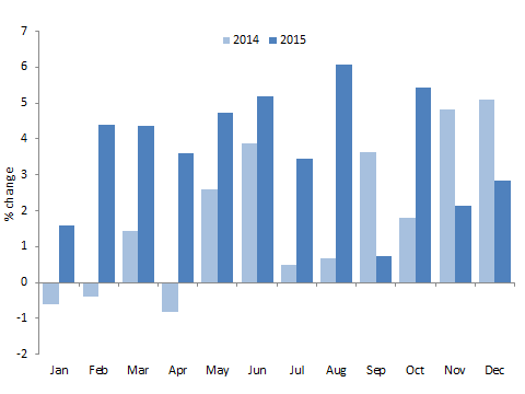 Pig meat production increased by over 4 per cent in 2015, to almost 900,000 tonnes, the fastest growth since 2011. Growth was slightly slower in the second half of the year but December’s output of 68,900 tonnes was still 3 per cent higher than a year earlier.