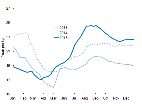 From April 2015 onwards, the wholesale pig price rose steadily, greatly exceeding levels seen in 2013 and 2014.