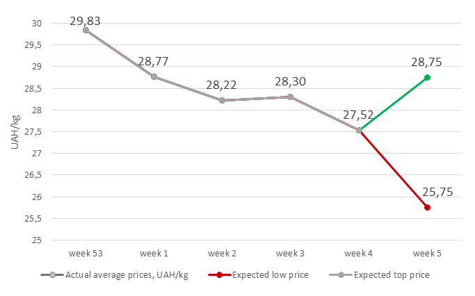 January ended on minor note for pig producers. On the fourth week of the year the average price has settled at level of 27.52 UAH/kg. It is 2.75% lower the week earlier. However, pork price decrease doesn’t stop at that.