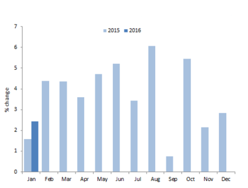 Higher production levels were due to a combination of factors. Clean pig slaughterings in January 2016 increased 2 per cent on the same period last year, to 978,800 head, and the average carcase weight increased over 1 per cent to 83.8kg. Therefore more, heavier pigs were coming forward to slaughter.