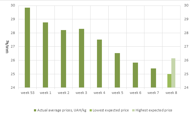 The third decade of February brings to pig producers a certain relief: price decrease has stopped. Although the average price mark has come down to 25.4 UAH/kg during the 8th week, the auction, in next-to-last Friday of winter, closed on positive note. Prices on live pigs decided to grow.