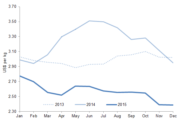 Based on the prices of the four major exporters (the EU, US, Canada and Brazil), the average export pork price finished 2015 at $2.38/kg. This is the lowest level for over six years, $0.57 lower than the same point last year and over a dollar less than the price peak recorded in June 2014.