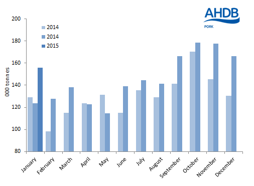 The strong performance of EU exporters in the final months of 2015 continued into January, with pork shipments up by more than a quarter compared with a year before, at 156,000 tonnes.