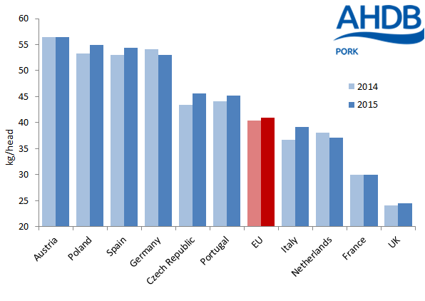 The average person in the EU consumed 40.9kg of pig meat in 2015, the largest amount since 2011.