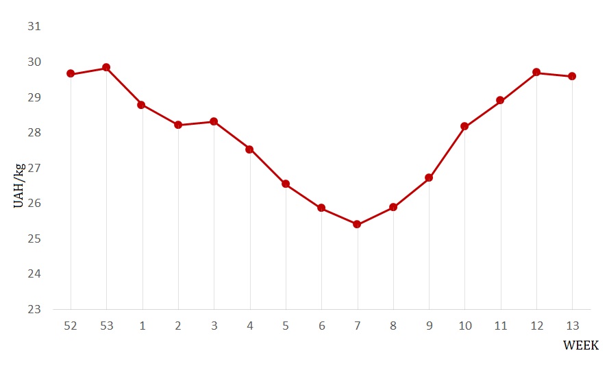 During the previous week, the majority of pig producers have sold live pigs by planned prices that varied within 29-30 UAH/kg. But the auction in the first days of April has finished not as happily as wished it to be for some market operators. The price of kilo pork LWE has to be decreased by 0.2-0.5 UAH/kg.
