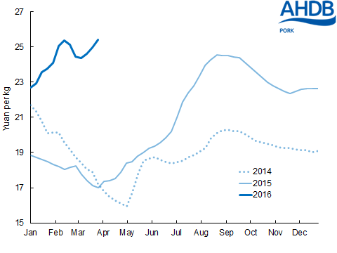 The high price level is evidenced by wholesale pork prices, which tend to track pig prices closely. Over the last couple of months, these have fluctuated around 25 yuan/kg (£2.70/kg) and, if anything, have been increasing further in the latest weeks.