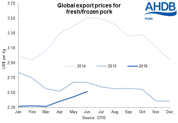 Although not perfect, export prices give a good indication of how farmgate prices will have developed on a global basis. Having started the year at a fraction over US$2.30 per kg, the average value of pork traded from the four major global exporters (EU, US, Canada and Brazil) reached $2.52 in June. This was the highest level since last October but was still 12 cents below June 2015.