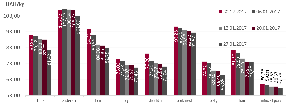 Retail pork prices continued downward movement in late January. Thus, pork steak dropped in price the most. Its price lost 6.6 UAH/kg for the current week. On supermarket shelves, tenderloin price decreased by 4 UAH/kg or 3.8% — to 102.69 UAH/kg. Pork belly also dropped by 3.8%. At the end of 4-th week it could be purchased for 65.86 UAH/kg. The retail price of loin, leg and minced pork weakened by 1.5-2% or 1-1,6 USD/kg last week. Should be noted that in retail networks pork cuts gone down in price from 4 to 12% during the first month of January. Steak, loin, shoulder, belly and ham cheapened most notably.