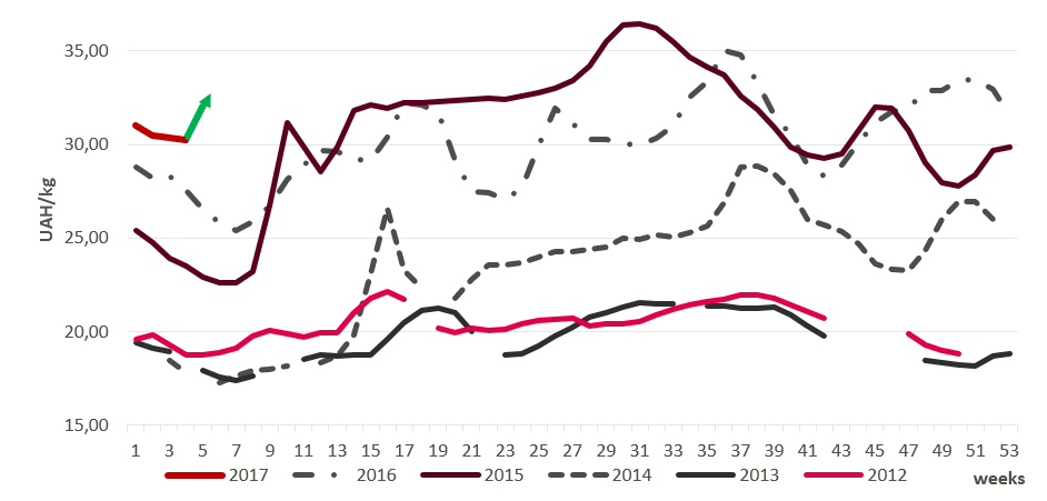 While the previous week average price was slightly higher than 30 UAH/kg, this figure could reach up to 32 UAH/kg in the first days of February.Purchasers willingness to compromise was caused by a supply of live pigs limited considerably and adverse weather conditions. Consequently, pork producers have managed to dispose the livestock by the price higher than the previous week by1.5 UAH/kg, and at times 2 UAH/kg.