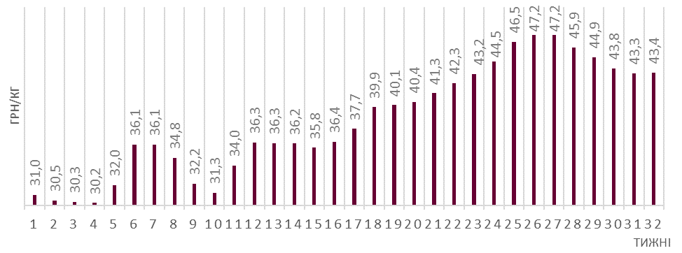 Ограниченность предложения живка свиней позволила котировкам укрепиться на достигнутых позициях. Так, плановая ценовая отметка второй недели августа практически равна фактической предыдущего и составляет 43,4 грн/кг.