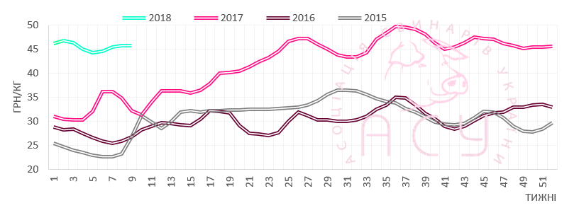 Цены на живок свиней в конце зимы укрепляются. Так, плановые цены восьмой недели в большинстве случаев были постоянными, однако «точечные» подъемы, в частности на востоке страны, скорректировали среднерыночную отметку на полпроцента. Надежды производителей свинины относительно плановых цен текущей недели оправдались: на рубеже сезонов они остались на достигнутом уровне. Тем не менее, произошла консолидация цен в более узком ценовом диапазоне, поэтому большинство товарных партий на этой неделе «расписали» по 45-46 грн/кг.