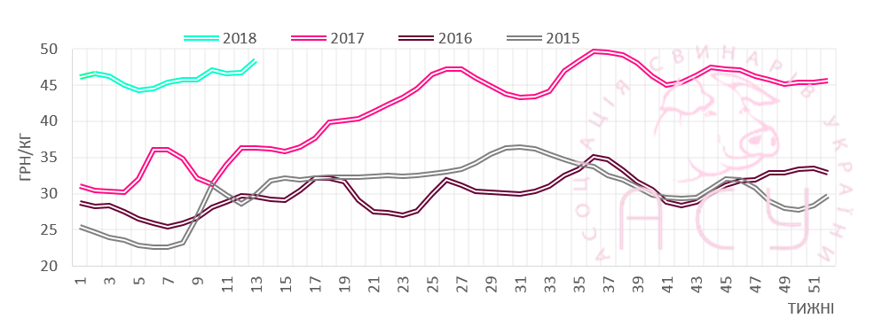 В последнюю неделю марта заготовка свинины к Пасхе ощутимо оживилась. Это отразилось и на закупочной цене. В частности, диапазон плановых цен реализации товарного поголовья повысился до уровня 47-49,5 грн/кг, а ожидаемая среднерыночная отметка из-за этого «подпрыгнула» более чем на 3,5% за неделю.