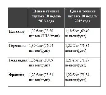 Эта ситуация будет продолжаться в течение некоторого времени, уверены эксперты, в результате чего цена в начале года будет благоприятной для производителей, на уровне в 1,377 € / кг (81,04 центов / фунт), как сейчас. Мы можем сравнить цены в течение первых 10 недель в 2013 году, в 2012 году.