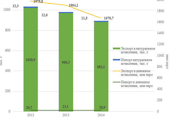 Такие явления привели к уменьшению внешнеторгового оборота на 233,41 млн евро только за первые четыре месяца текущего года. Некоторое сокращение средних экспортных цен не стимулировало расширение экспорта. Стоит отметить, что импорт сдерживается не только высоким уровнем внутреннего предложения, но и «отголоском» стремительного взлета средней его цены в соответствующем периоде 2013 года.