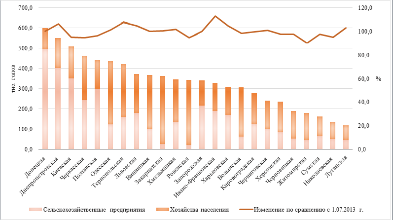 Численность поголовья свиней в сельскохозяйственных предприятиях и хозяйствах населения в разрезе областей Украины (тыс. голов) и его изменение по сравнению с 1.07.2013 г (%).