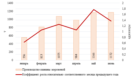 На протяжении последних пяти месяцев коэффициент роста производства мороженой свинины относительно соответствующего месяца предыдущего года колебался в пределах 1,06-1,77. О таком превышении прошлогодних показателей свидетельствуют данные Государственной службы статистики Украины.