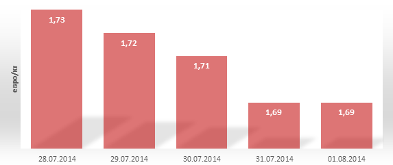 Наивысшей была цена на торгах 28-го июля и составила 1,73 евро/кг. За вторник и среду цена претерпела одноцентовое уменьшения. Торги 31 июля и 1 августа отличились еще низким уровнем цен — 1,69 евро/кг, что на 4 евроцента ниже, чем в предыдущей понедельник.