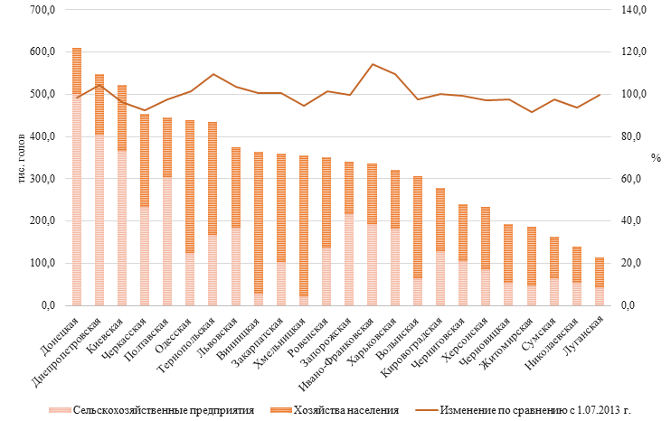 Благодаря сельскохозяйственным предприятиям наблюдается положительная динамика роста поголовья: разрыв между численностью поголовья по состоянию на первое июля текущего и 2013 года увеличился до 1,5% (для сравнения — в предыдущем месяце разница равнялась 1,4%). Об этом сообщает Государственная служба статистики Украины.