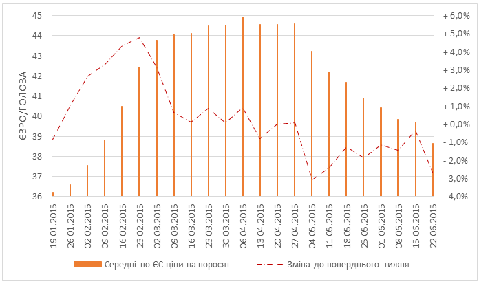 На рынке товарных поросят в странах ЕС продолжается падение цен. Так, на 26-й неделе цена одной головы составляла 38,66 евро, то есть на 2,7% или 1,05 евро меньше чем неделей ранее. Такую негативную динамику отмечает отчет Еврокомиссии.
