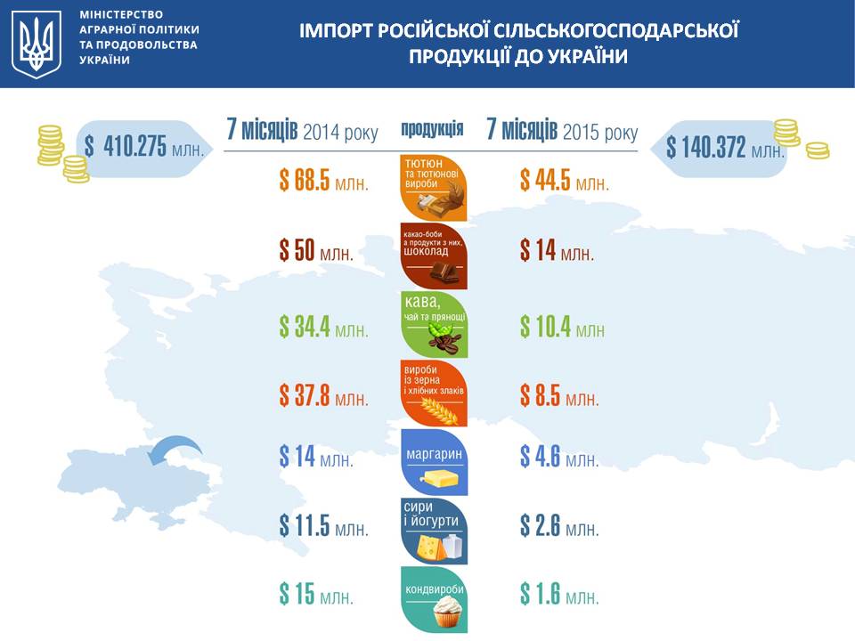 За 7 месяцев 2015 года общий импорт аграрной продукции из РФ сократился на 66% и составляет 140,372 млн долларов США (по сравнению с 410, 275 млн долларов США за 7 месяцев 2014). Основную долю импорта составили табак и табачные изделия; какао-бобы и продукты из них, шоколад; кофе, чай и пряности; изделия из зерна и хлебных злаков; маргарин; сыры и йогурты, кондитерские изделия.