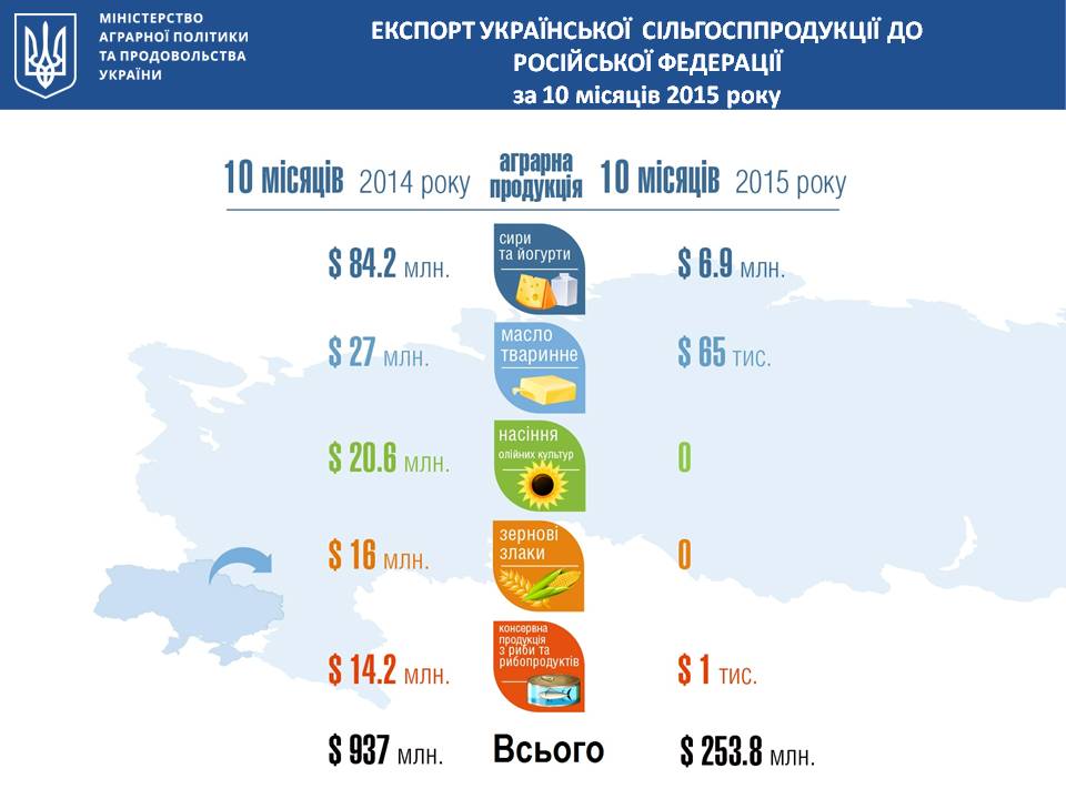 Как сообщил министр, за 10 месяцев текущего года экспорт украинской аграрной продукции в Российскую Федерацию уменьшился более чем в 3,5 раза и составляет 253,8 млн долларов США (за соответствующий период прошлого года — 937 млн долларов США).