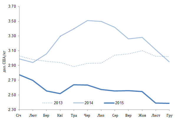 С ростом предложения в 2015-м, американские цены ощутимо просели. Улучшение эпизоотической ситуации (восстановление после вспышек ЭДС в 2014-м) заставило многих производителей «расширять горизонты». Ценам пришлось дешеветь чтобы стать более конкурентоспособными на международной арене, в этом им помог «сильный» доллар.