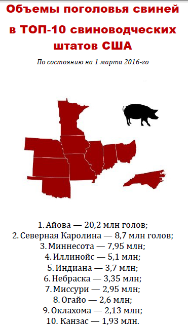 Согласно мартовской «переписи» свинопоголовья, в США выделилась десятка крупнейших штатов-производителей. Так, в Айове, Северной Каролине, Миннесоте, Иллинойсе, Индиане, Небраске, Миссури, Огайо, Оклахоме и Канзасе содержится 87% всех свиней в стране. Такие данные обнародовало Министерство сельского хозяйства США.