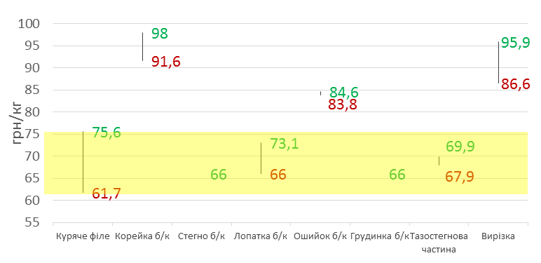 Конечно, свинина также подорожала. Так, максимальная цена на корейку бескостную и вырезку приблизилась к отметке 100 грн/кг. Однако, среди обрушившихся мясных частей в начале месяца были и более бюджетные предложения. В частности, средняя цена обваленого бедра и грудки составляла 66,0 грн/кг. С этой же отметки стартовал диапазон розничных цен на лопатку бескостную, а цена тазобедренной части варьировала в пределах 67,9-69,9 грн/кг. Поэтому цена упомянутых частей вполне вписывается в диапазон цены куриного филе. А значит, украинский покупатель имеет возможность приобрести как куриную мякоть, так и бескостную свинину без лишних убытков для кошелька.
