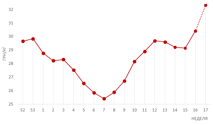 В течение 16-й недели цена на живок, в среднем, составляла 30,4 грн/кг. Однако за неделю до Пасхи свиноводы прогнозировали дальнейший подъем: накануне праздника средняя цена на свинину в живом весе может превысить 32 грн/кг.