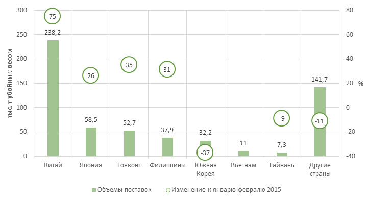 Стоит отметить, что всего на три основные страны сбыта — Китай, Японию и Гонконг — пришлось более 60% экспортируемых объемов. Так, в Поднебесную реализовали 238 тыс. т продукции свиноводства, что на три четверти превышает объемы поставок в первые два месяца прошлого года. Удельный вес отгрузок в Японию и Гонконг не превысил 10% и 9%. Но объемы выросли более чем на четверть и треть соответственно. Активнее торговали и с Филиппинами, куда реализовали почти 34 тыс. т продукции свиноводства — на 31% больше, чем в прошлом году. Особое внимание уделили и сотрудничеству с вьетнамским контрагентами: так за первые два месяца года в эту страну поставили 10,98 тыс. т (более четверти объемов экспортируемых за весь 2015-й).