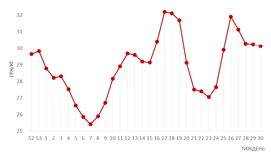 В течение последних трех недель на рынке живка наблюдается относительное постоянство закупочных цен. В середине месяца свиней убойных кондиций в среднем реализовали по 30,3 грн/кг. На 30-й неделе ожидают цены на уровне 30,1 грн/кг.