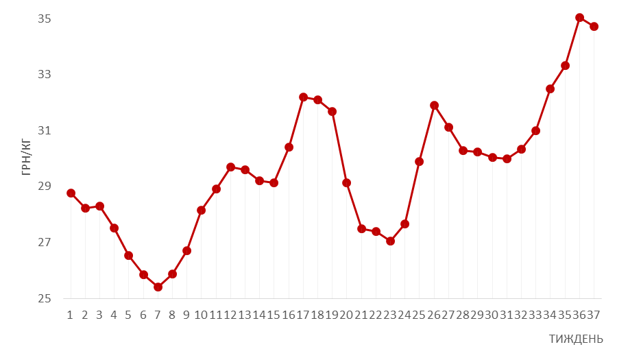 Первая неделя осени отметилась самыми высоким ценам на живок свиней убойных кондиций с начала года. Так, средняя цена на рынке живка достигала 35 грн/кг. На этой неделе большинство производителей свинины пытались закрепиться на достигнутом уровне, однако некоторые должны были скорректировать цену на 0,25-0,5 грн/кг в сторону понижения.