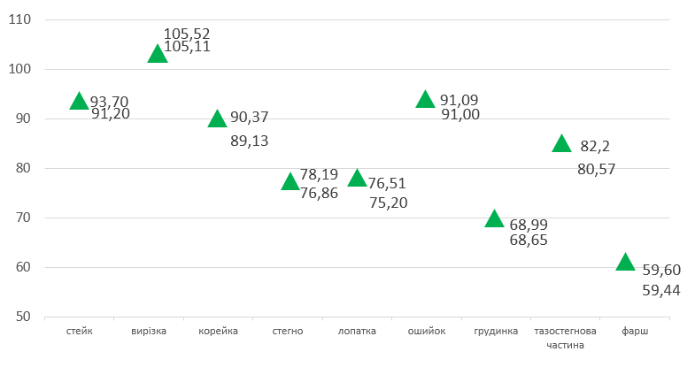 Розничные цены на свинину продолжают расти. Однако, в течение 50-й недели подорожание было умеренным. В частности, по результатам предыдущей, цены на отдельные части поднялись от 2% до 8,5%, по сравнению с первыми днями декабря. Так, средняя цена свиной вырезки и стейков выросли на 5 грн/кг, а тазобедренная часть подорожала более чем на 6 грн/кг, превысив отметку 80 грн/кг. Свиное бедро подорожало на 2,4 грн/кг. Во второй декаде месяца цены на свиные мясные части поднялись не так сильно. Так, корейка, бедро и лопатка подорожали в среднем на 1,3 грн/кг, тазобедренная часть — на 1,6 грн/кг, а подорожание вырезки и грудинки было меньше полгривны на килограмме.