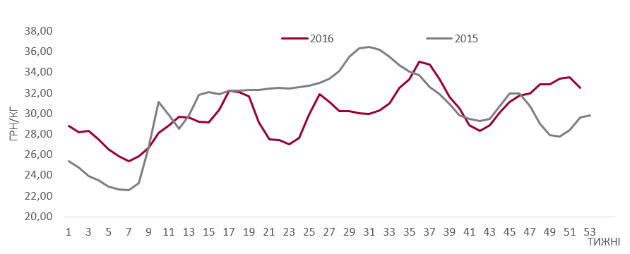 Удешевление живка свиней было обусловлено значительно более слабым спросом со стороны мясопереработчиков. Некоторые из них даже отказывались от ранее «забронированных» партий. Давило на цену и предложение, избыток которого образовался из-за сдерживания продаж живка отдельными производителями. Как следствие, переходящие запасы на прошлой неделе на фоне низкой активности закупки вызвали проседание средних цен до уровня нижней границы диапазона на прошлой неделе (32,5 грн/кг). Так, на этой неделе ожидаемые цены на живок преимущественно варьируют в диапазоне 32-33 грн/кг, однако иногда встречаются и цені несколько выше.