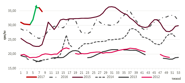 По мере приближения к концу зимнего сезона цены на рынке живца изменили направление движения. На предыдущей неделе цены оставались относительно стабильными, а среднерыночная отметка оставалась на уровне первой декады месяца — около 36 грн/кг. Однако, в начале третьей декады февраля закупочные цены на живца свиней ощутимо «просели». По результатам торгов, на этой неделе большинство производителей реализовывали товарное поголовье на 0,7-2,7 грн/кг дешевле чем в середине месяца.